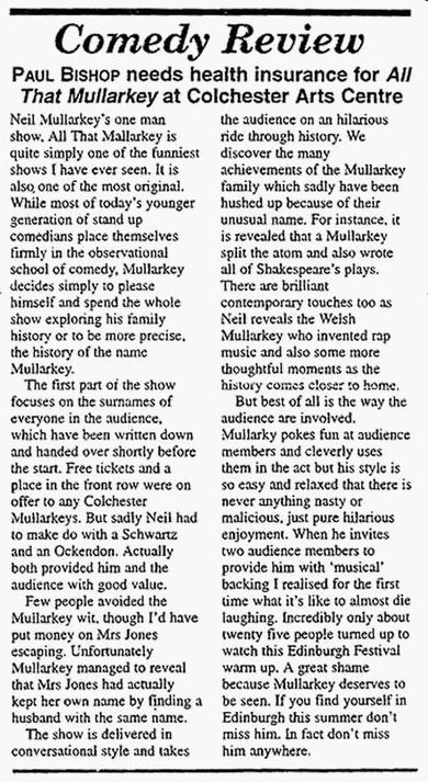 I caught your show at the Gilded Balloon (Paul Merton was in the audience and a rather nice chap called Dobie). Anyway, I just thought I'd let you know that I thought the show was brill and I'm really sorry that I'm not a Mullarkey myself.